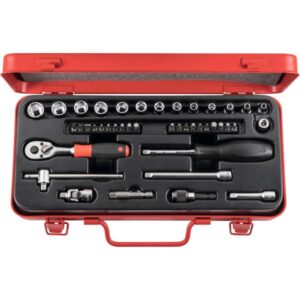 Dotazione: impugnatura isolata, lame cacciaviti, bit, portabit, bussole, prolunga, raccordo, cricchetto, portaviti, rilevatore di tensione, chiave a bocca